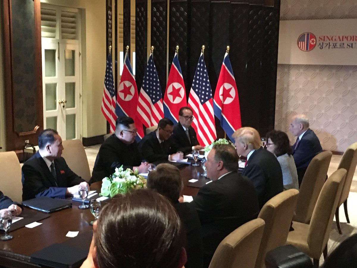 .@POTUS Trump, @SecPompeo, @AmbJohnBolton, and the U.S. delegation meet with North Korean leader Kim Jong Un and the #DPRK delegation at the #SingaporeSummit. pic.twitter.com/N1JUqVIceB