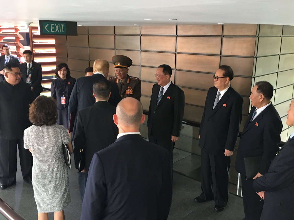 US Delegation greets North Korean Delegation and watches @POTUS and Leader Kim Jong Un meet for first time. #BTS #SingaporeSummit cc: @SecPompeo @AmbJohnBolton pic.twitter.com/DXuPi3o1yn